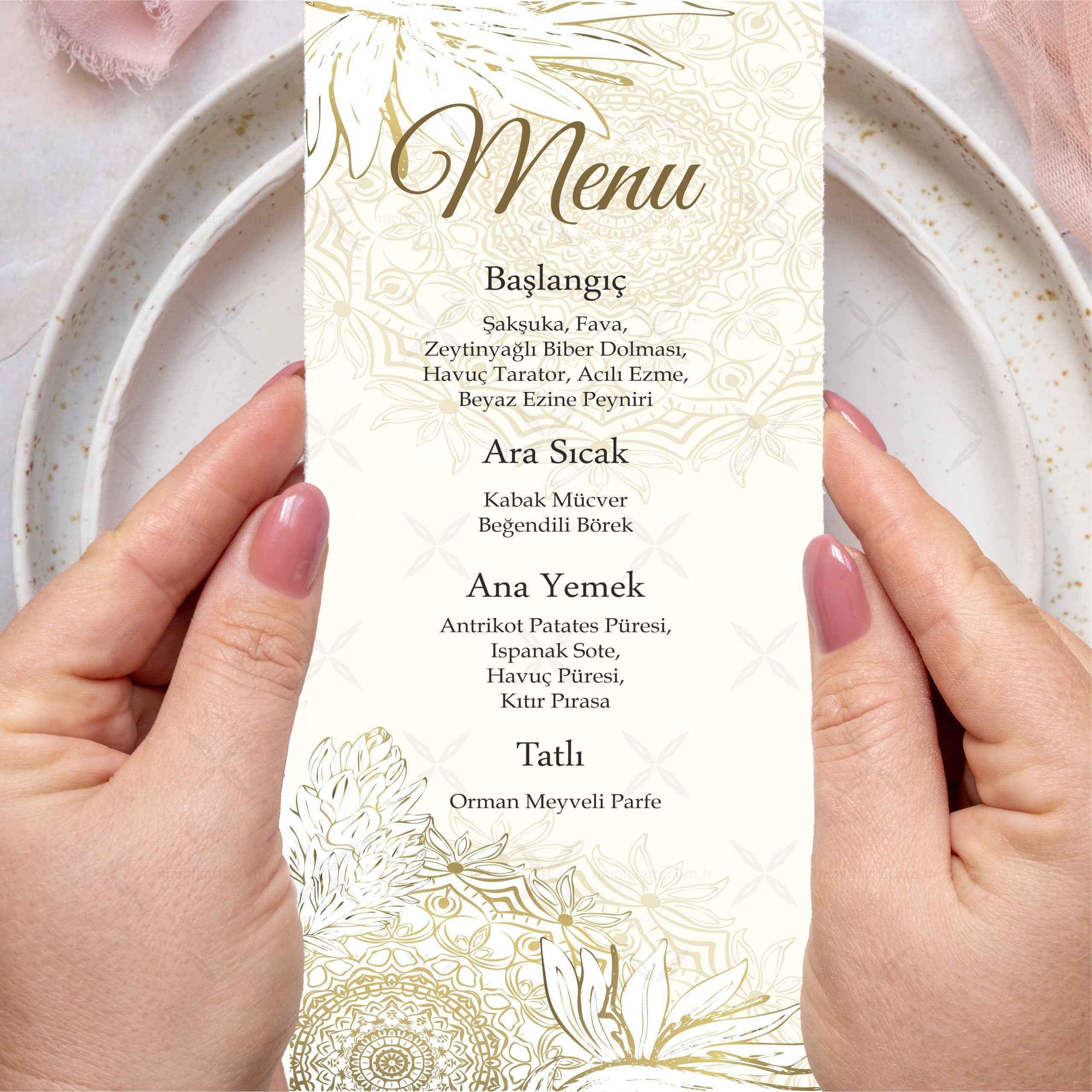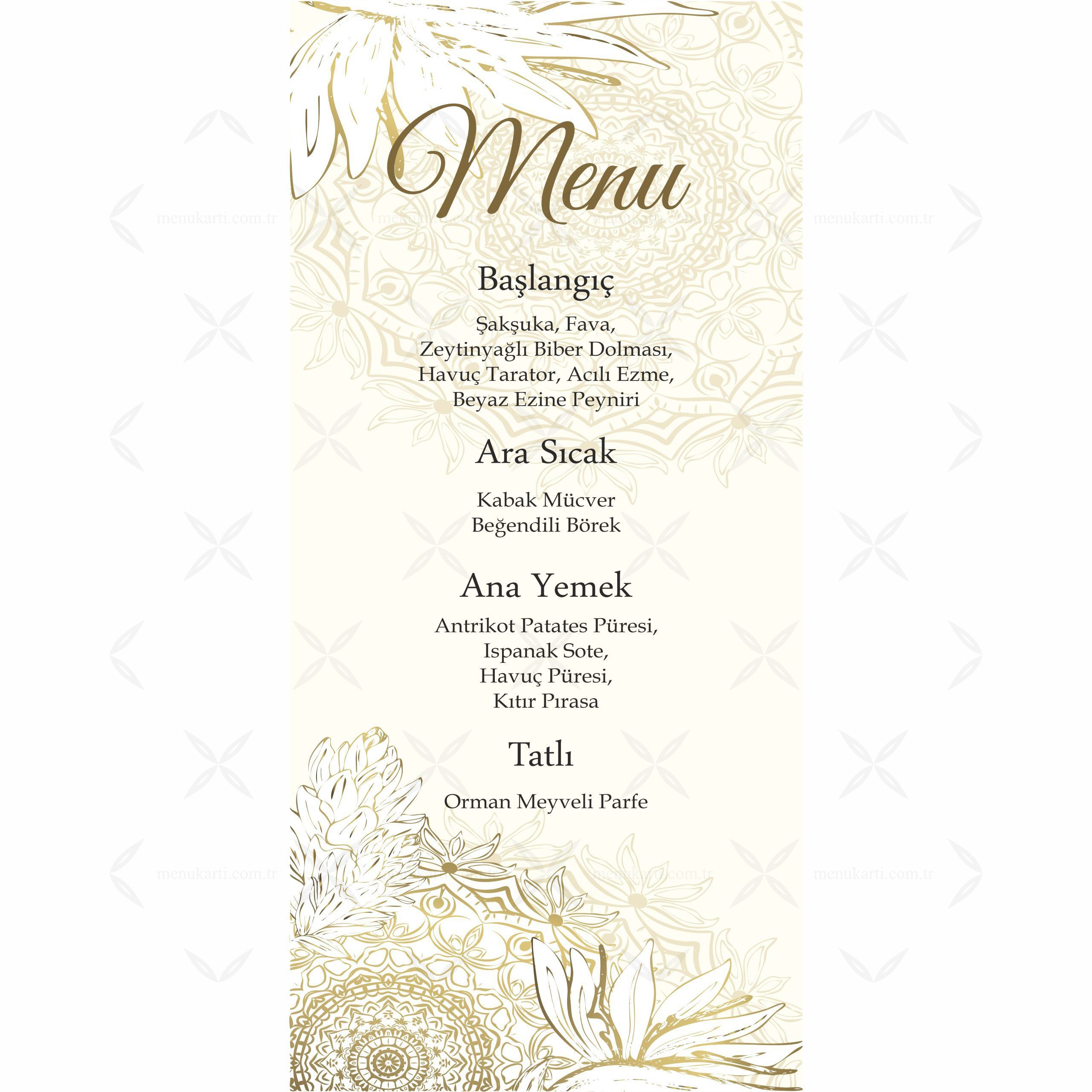 Düğün, Kına veya diğer organizasyonlarınızda kullanabileceğiniz menü kartı örneklerimiz büyük bir titizlikle baskı yapılıp, en kısa sürede sizlere ulaştırılmak üzere kargoya verilmektedir.